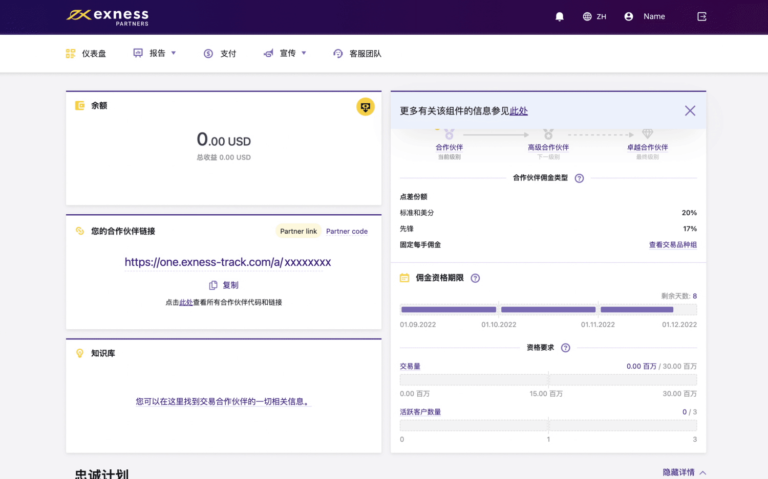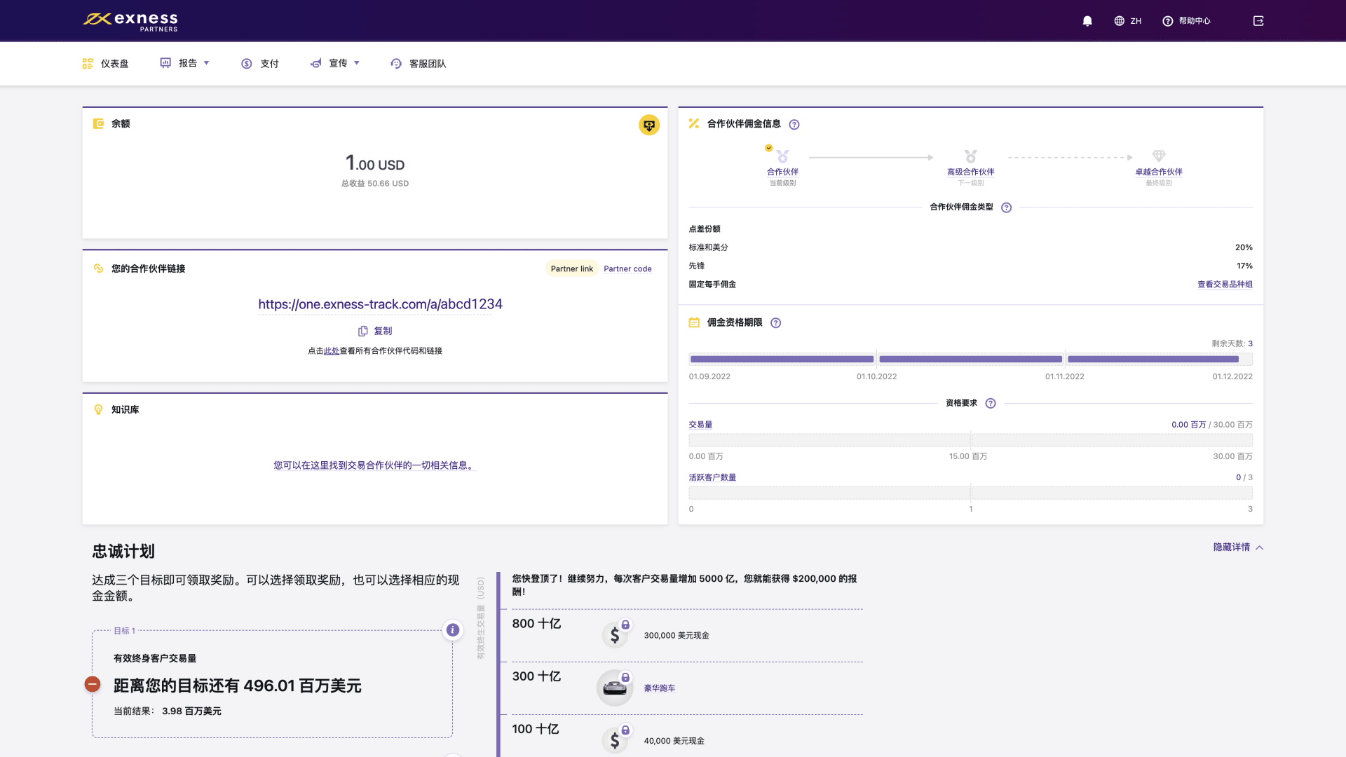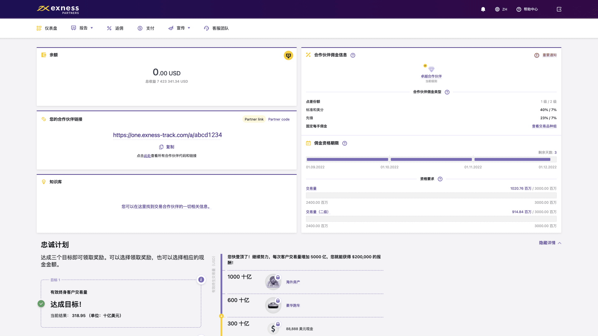 该版块对您的合作伙伴链接业绩进行评估,评估结果每两小时更新一次。 您会看到转介客户所进行的重要操作,例如点击、注册、转化率等,这将帮助您评估您的合作伙伴链接是否取得成效。