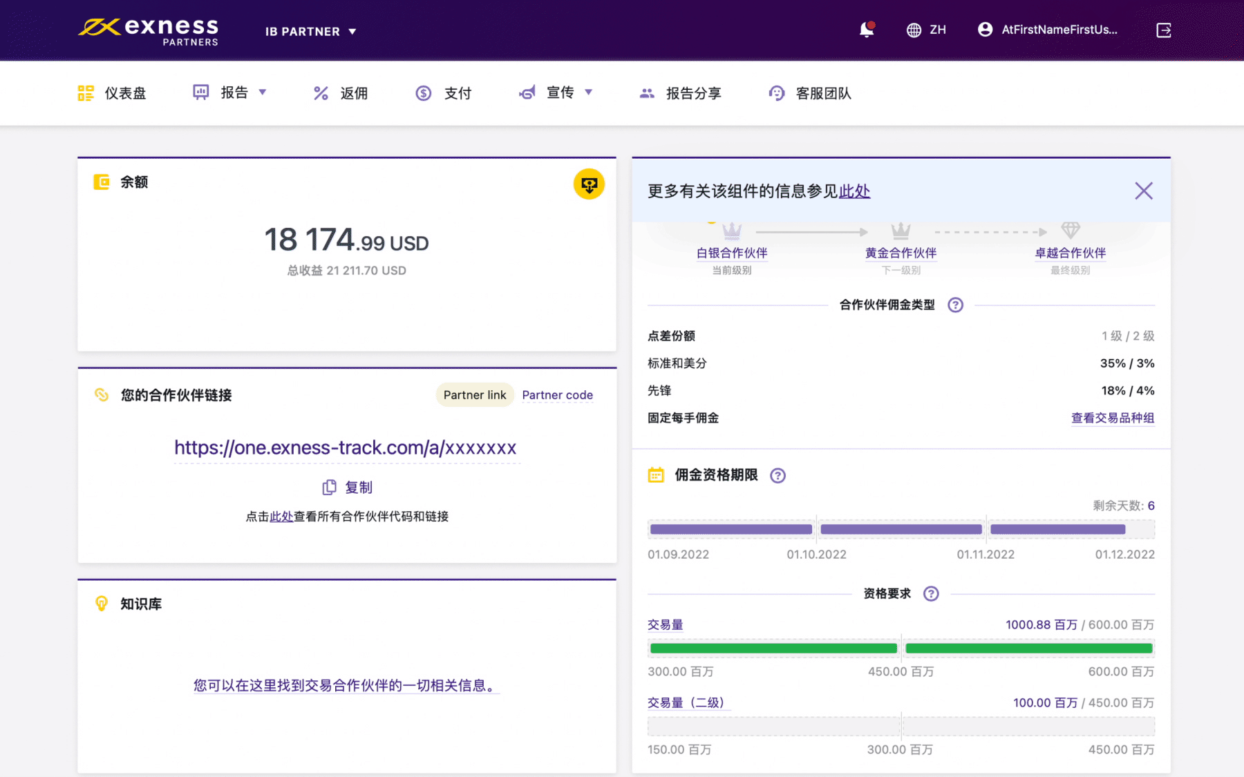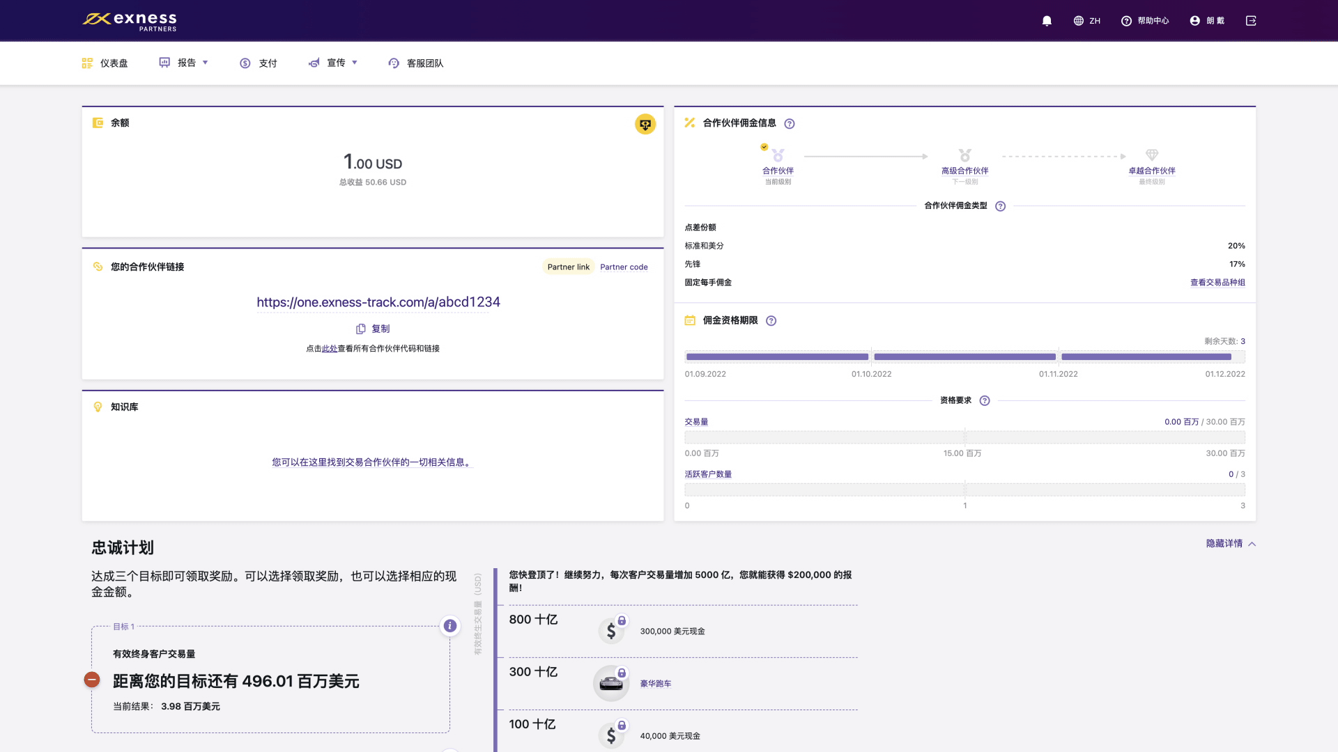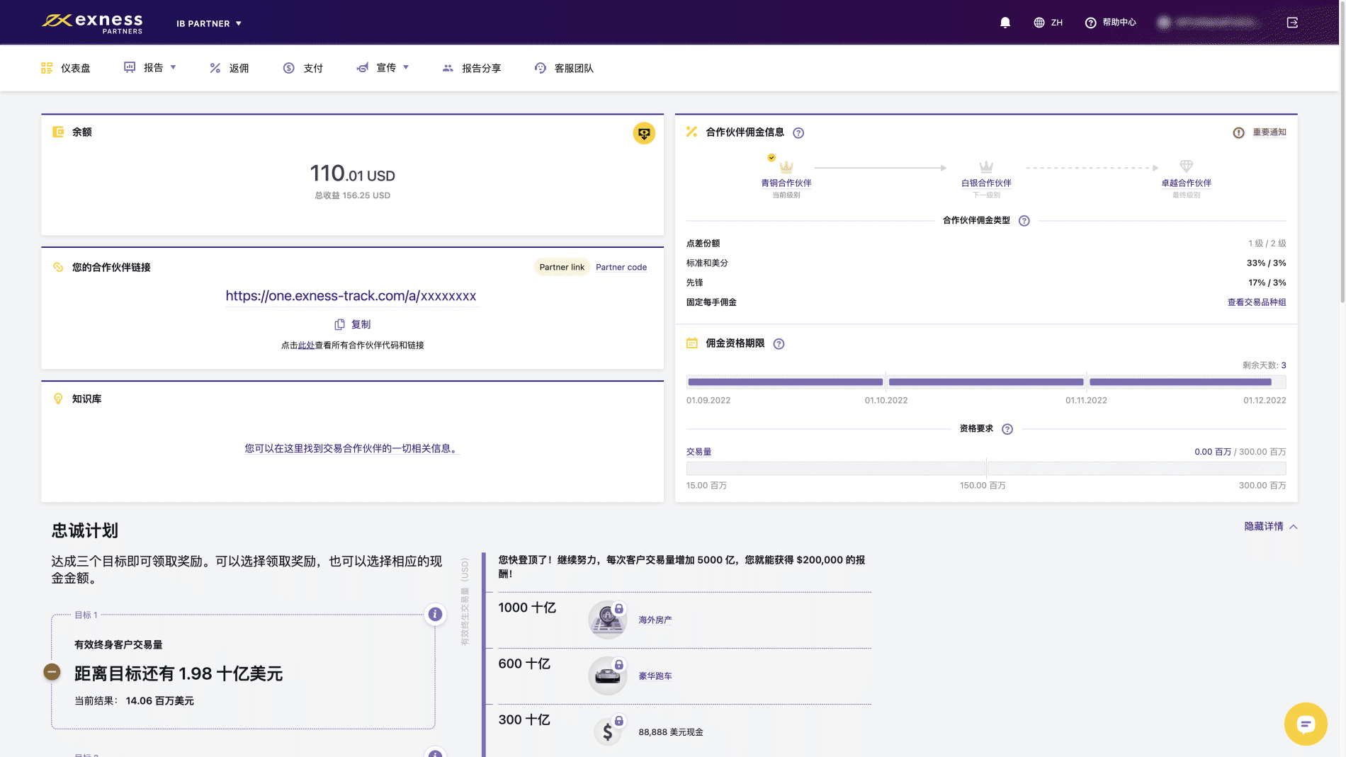 该版块对您的合作伙伴链接业绩进行评估,评估结果每两小时更新一次。 您会看到转介客户所进行的重要操作,例如点击、注册、转化率等,这将帮助您评估您的合作伙伴链接是否取得成效。