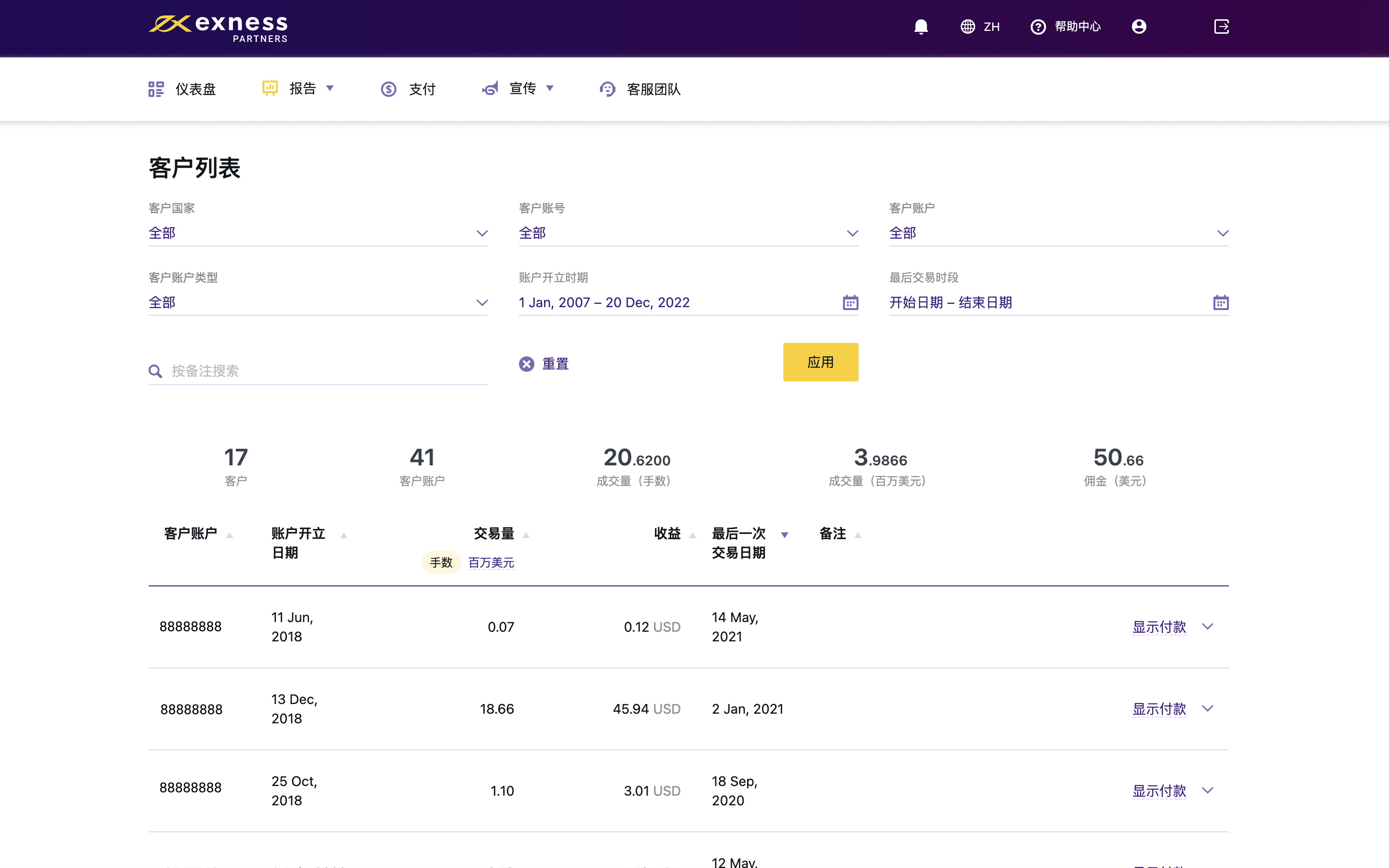 • 在EXNESS提供的众多筛选项中,选择适合您的筛选项,精确地找出您想要检索的信息。 点击应用CSVP-4996_ZH.gif 点击显示支付将跳转至“佣金记录”版块,您可在此处查看某笔特定交易的佣金详情。 客户交易