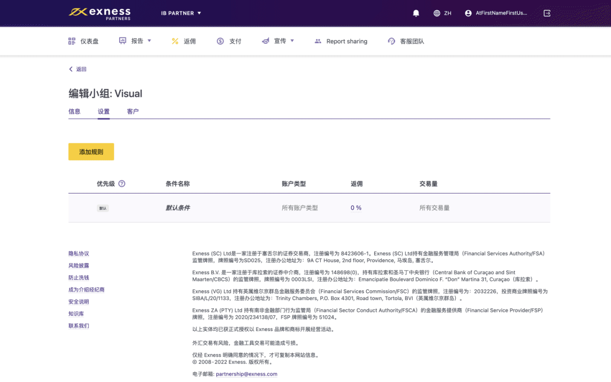 接下来,在设置选项卡下,可以根据交易量和账户类型创建条件,管理分配到小组的返佣。