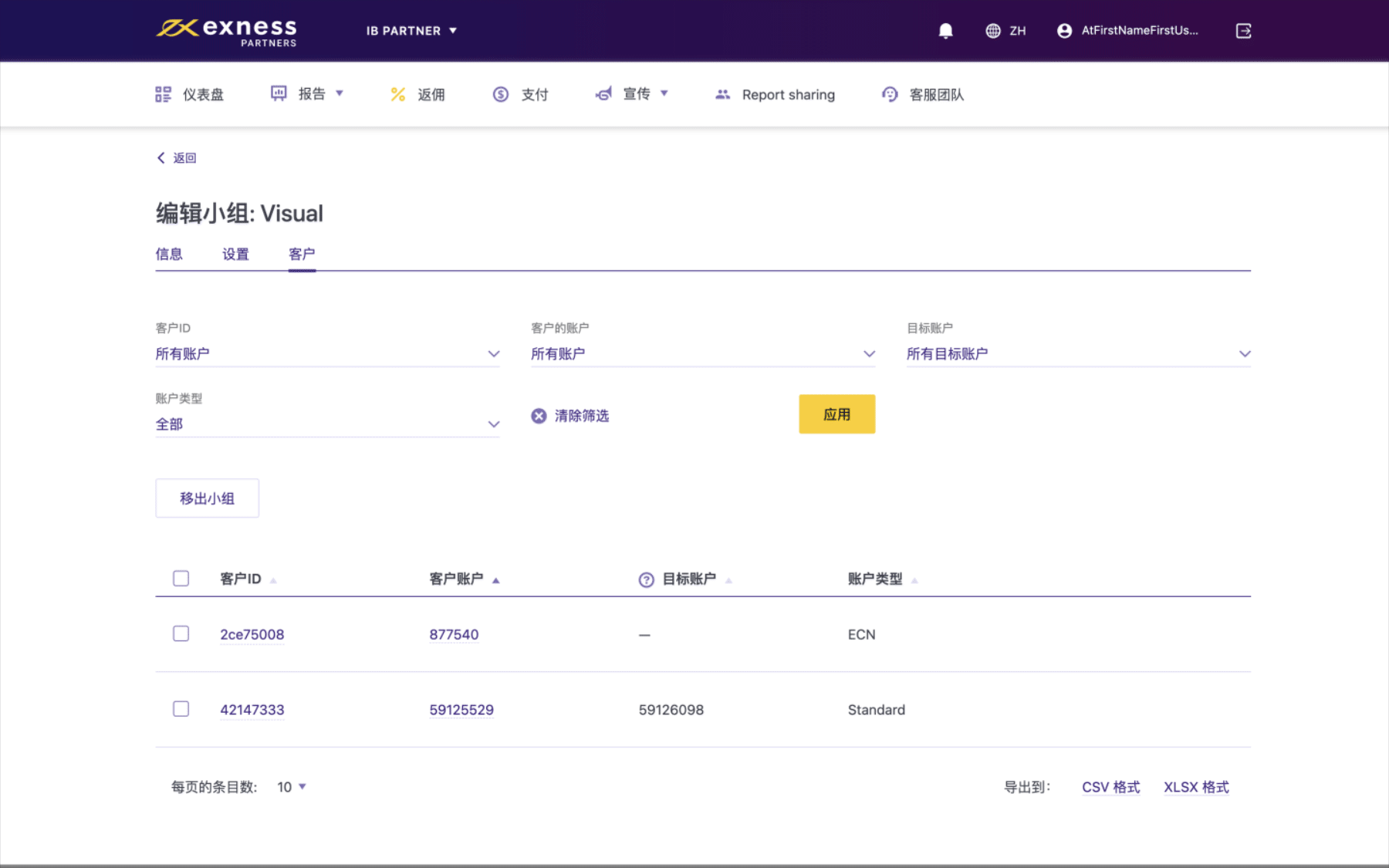 - 客户选项卡可让您选择单个客户并将其从小组移除;选好需要移除的客户后,点击从小组移除。 点击提交确认操作。