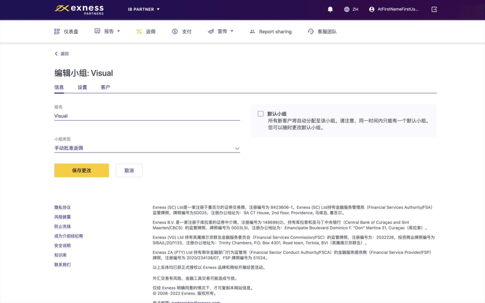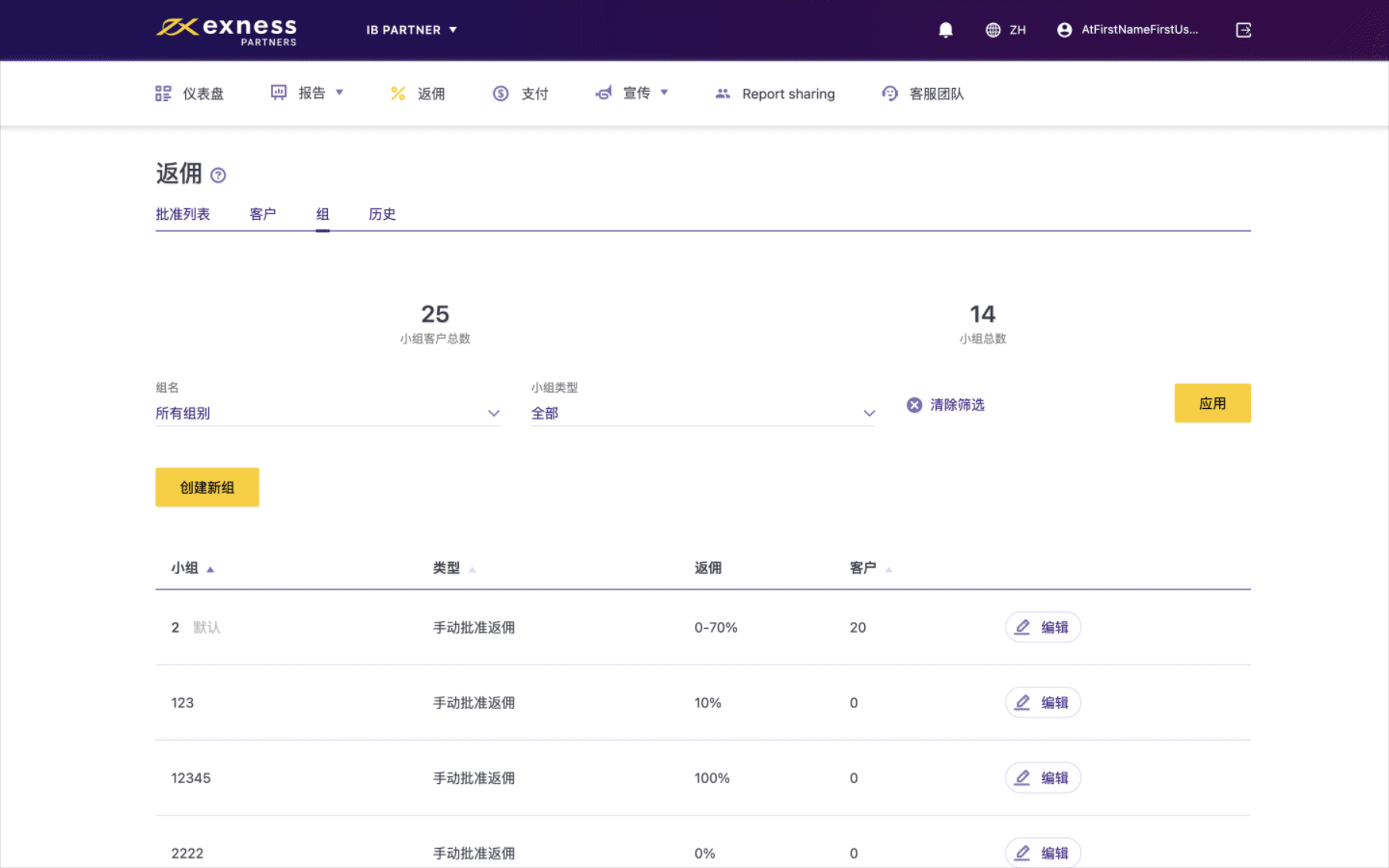 编辑小组时,您可以将小组类型更改为自动或手动批准组内客户返佣,为整个小组设置相同的返佣率,并从小组中删除客户。 请按照以下步骤使用这些功能: