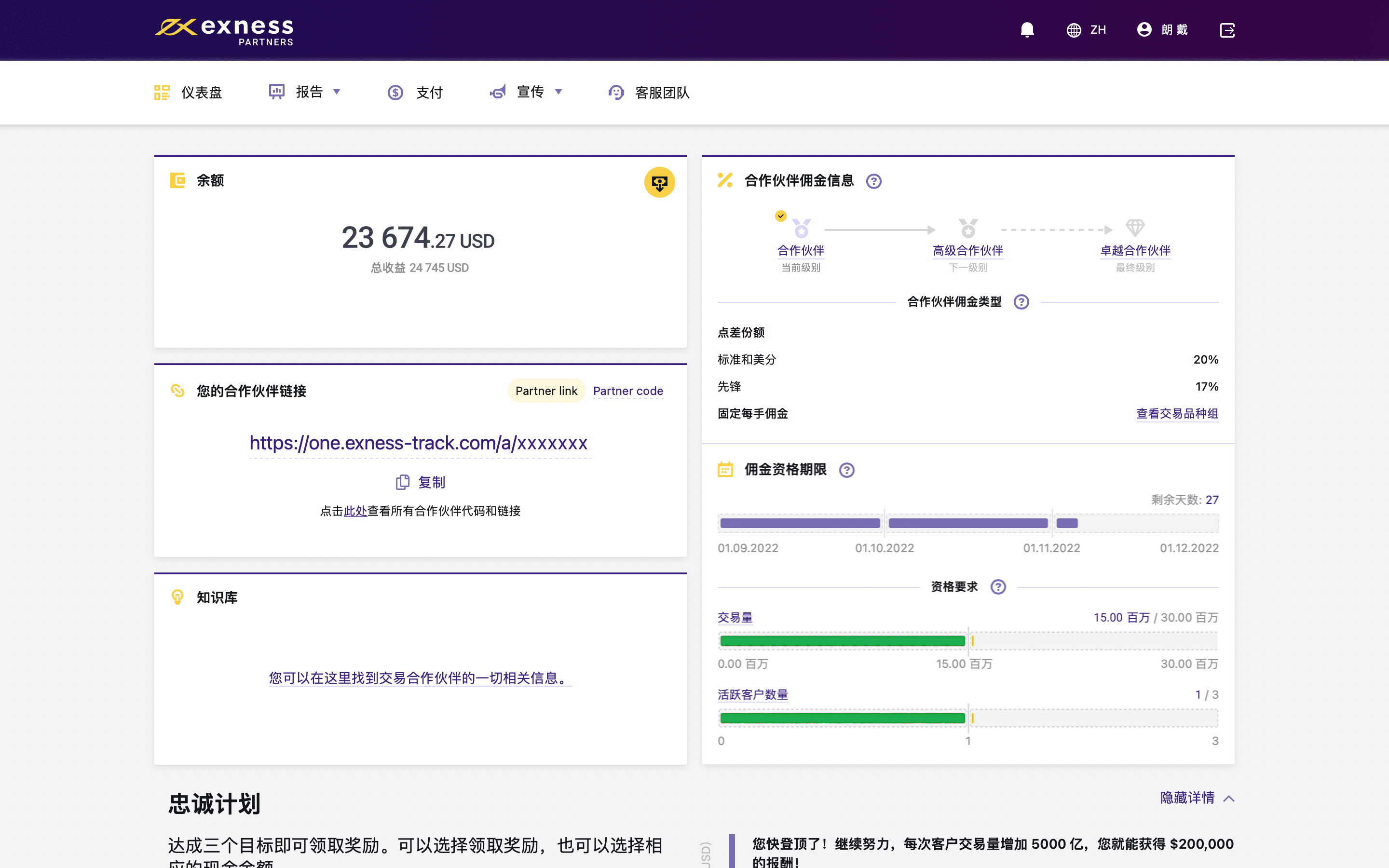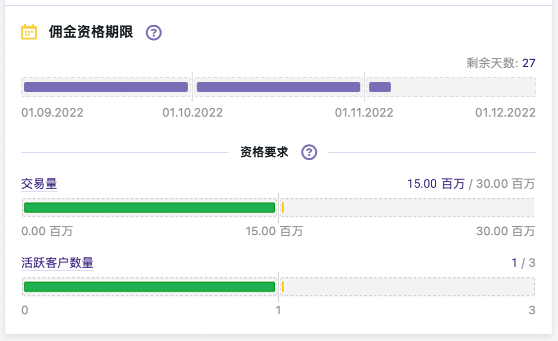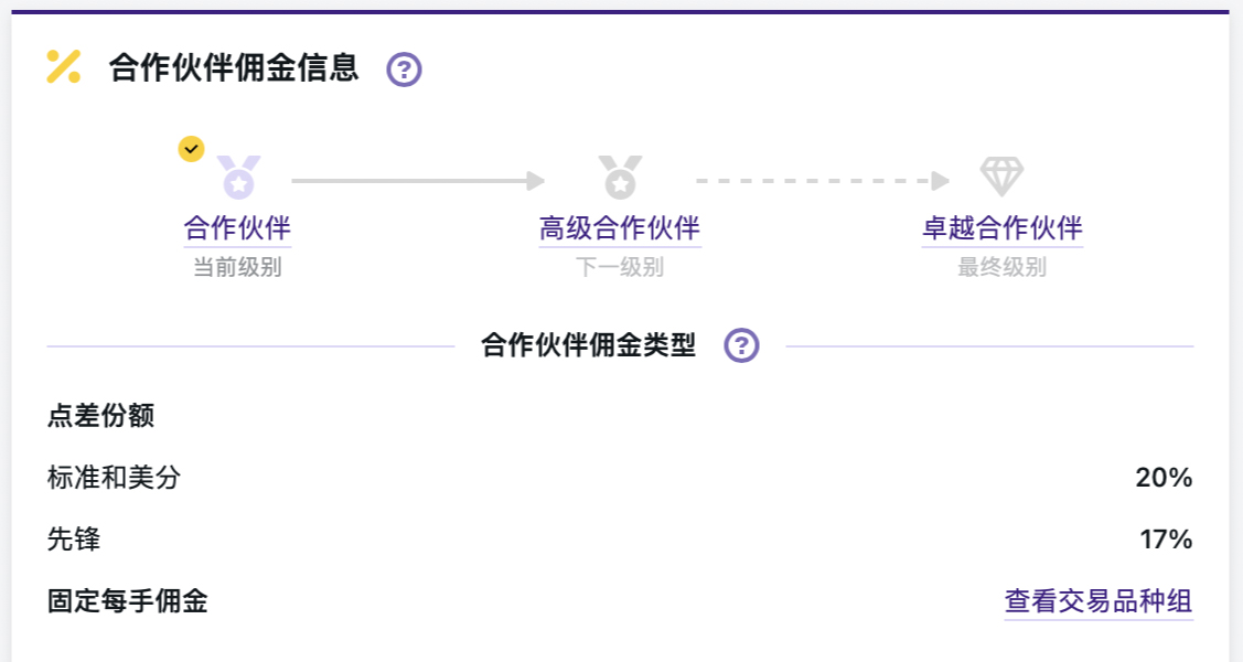 该面板不仅显示您当前的合作伙伴级别,还显示您可以达到的下一个和最终合作伙伴级别。 点击合作伙伴级别将显示各种账户类型的合作伙伴佣金结构。 您也可以切换至不同的合作伙伴级别,以查看相应的资格要求。