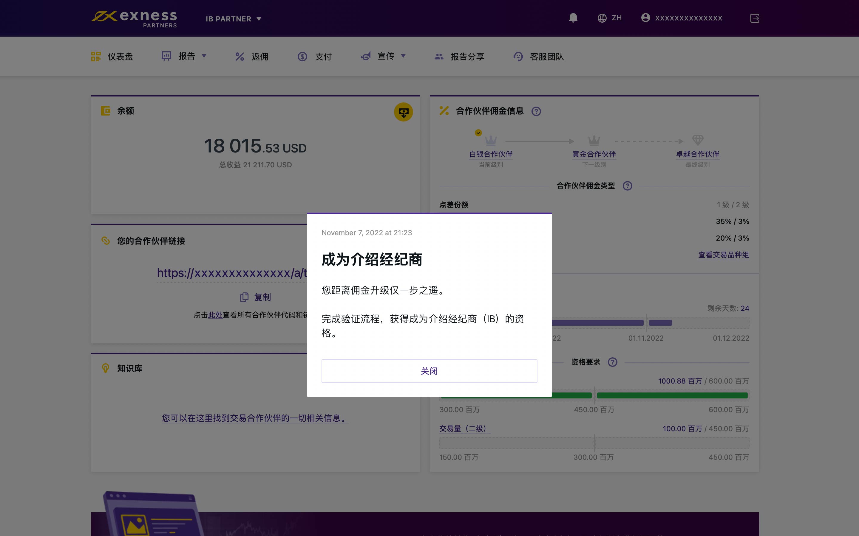 如果您有资格成为介绍经纪商 (IB),但尚未完成您的了解你的客户/KYC(完整的个人资料验证),个人专区中将显示一条通知,提示您要完成验证才能进行升级。