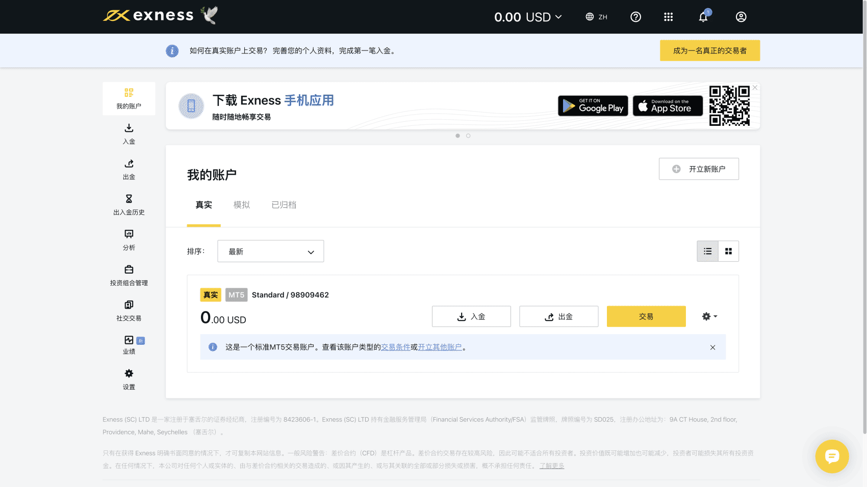 在注册 Exness 个人专区时,系统会为您开立一个模拟账户(包括 10,000 美元虚拟货币)和一个真实账户。