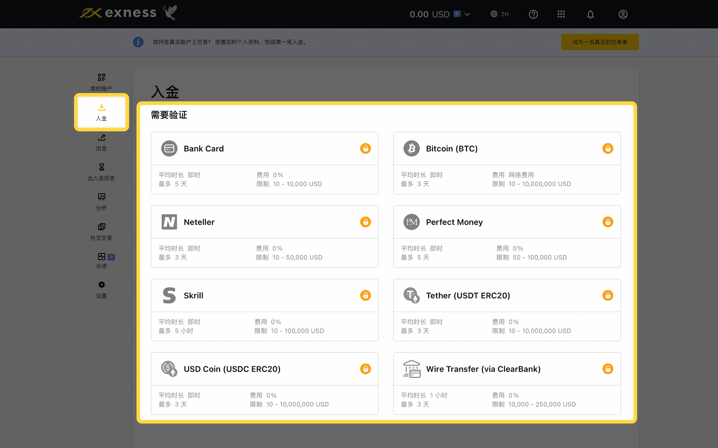 创建了个人专区之后,您就可以在入金选项卡看到所有可用的支付选项。 为了方便您查看,需要验证才可使用的支付方式将单独分类置于个人专区的需要验证版块里。