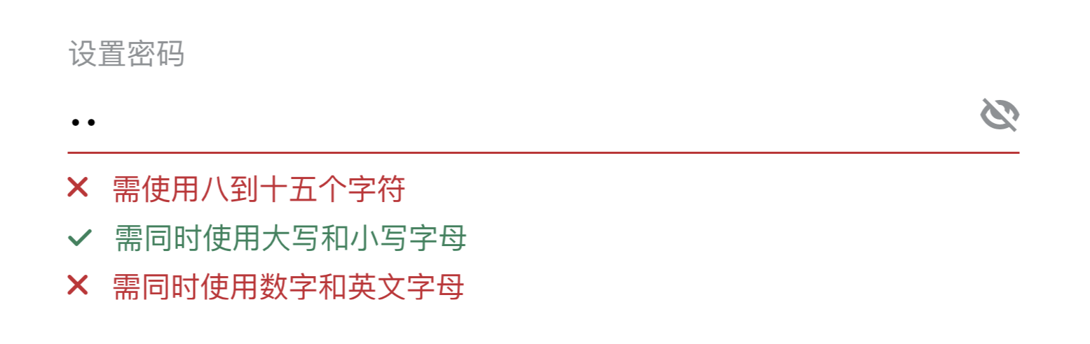 在您输入密码时,屏幕上的要求将会改变颜色,绿色说明已满足,红色说明未满足。 此外,仅当上述三项要求均显示为绿色时,您才能点击继续按钮。