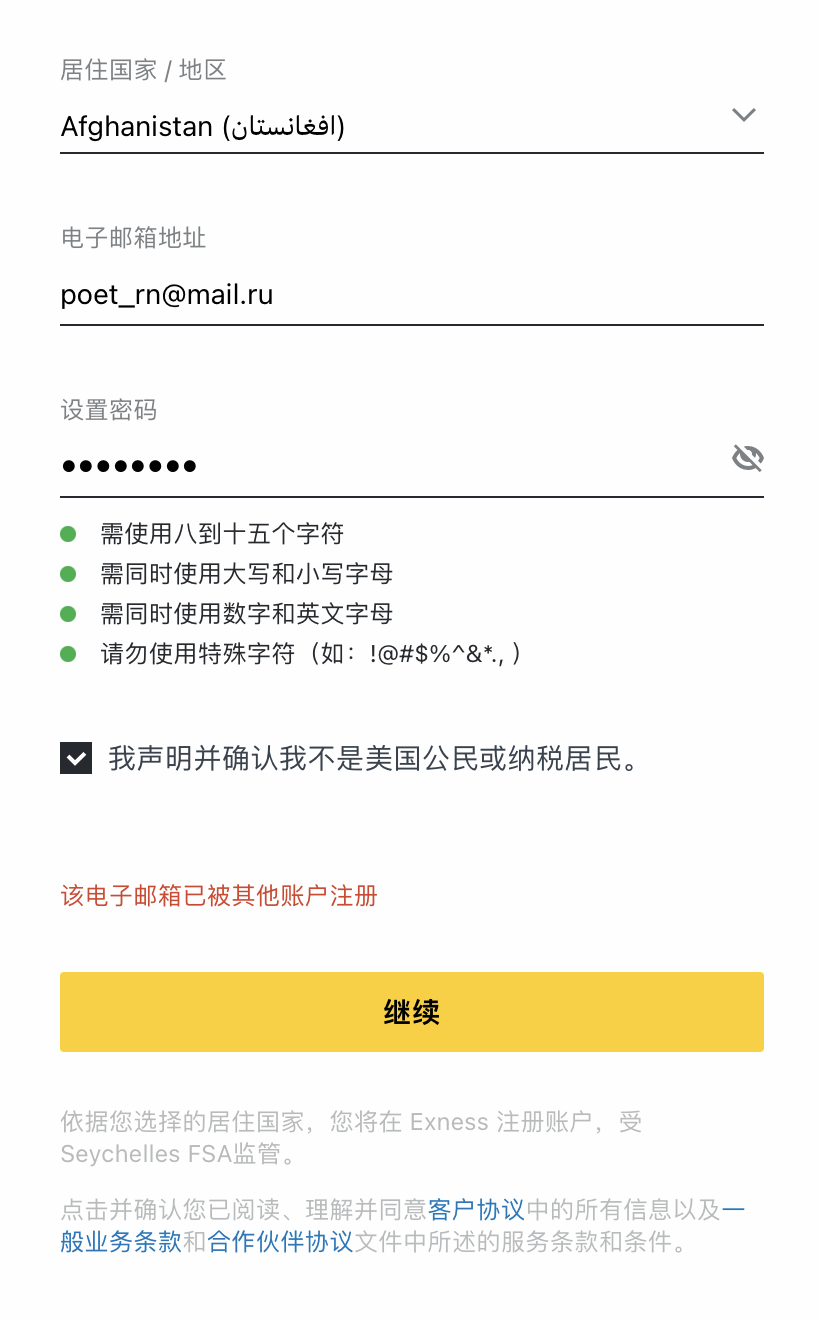 出现此错误,则说明该电子邮箱已被其他 Exness 账户注册,无法再次使用。