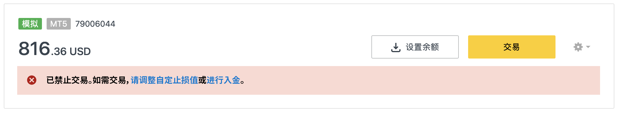 要重启交易,需降低相应账户的自定止损净值,或发起新的入金