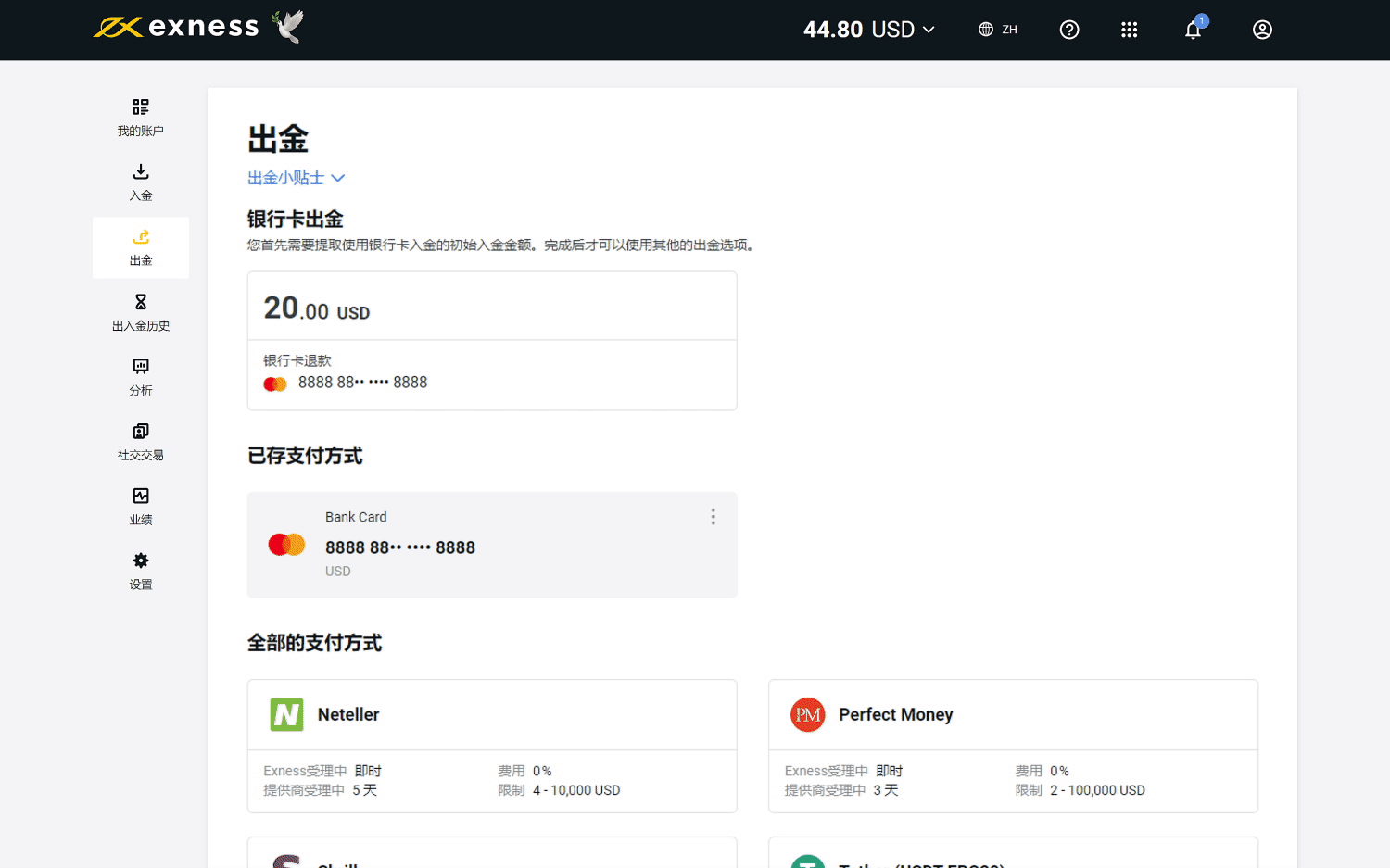 出金时必须使用入金时所使用的支付系统、账户和货币。 如果您在给交易账户入金时使用了多张银行卡和/或多个支付系统,出金时则必须根据各银行账户和/或支付系统的入金比例,按比原路返回资金。
