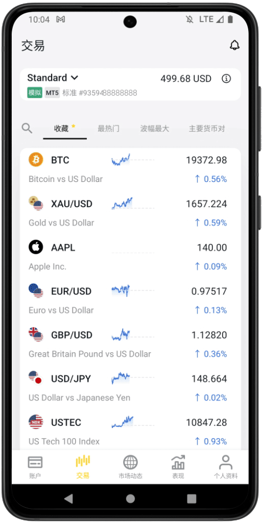 交易选项卡下,您可以轻松找到全部可供交易且分类明确的交易品种。 您可以滑动任一交易品种,并点击星号图标来收藏。