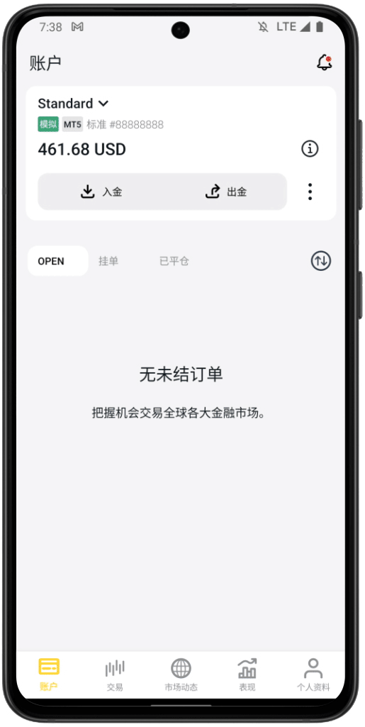 Exness 交易应用提供内置交易终端,这是一款完全由EXNESS的内部开发员自主研发的交易终端。 您可以通过内置交易终端在MT5账户**(模拟和真实账户)**上交易,而无需单独下载交易平台应用。