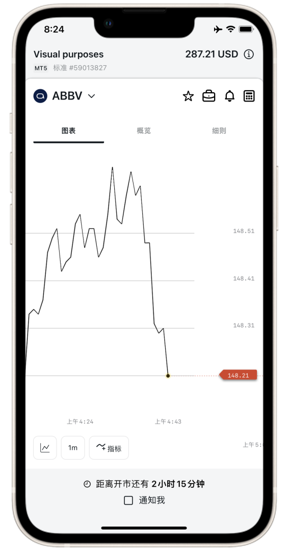 特别提示:如果您在收市后查看图表,您将会在页面底部看到关于何时开市的通知。 您可以点击通知我,设置提醒。