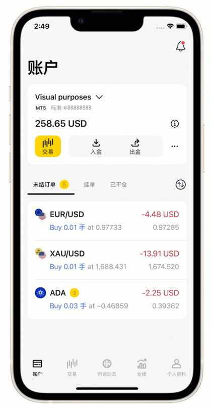 • 屏幕底部提供入金出金以及转账选项,方便您使用。