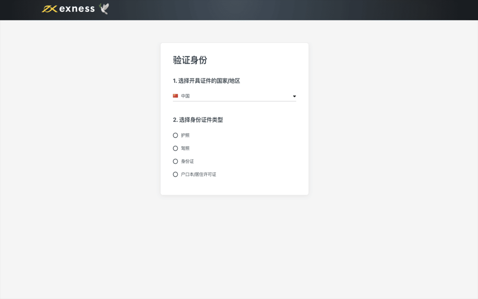 重要注意事项: POI文件应由合法机构正式签发,包含持有人姓名、年龄和照片。 文件不一定是由客户出生地或客户国籍国签发。 例如,居住于哥伦比亚的印度客户可以使用由印度、哥伦比亚或其他任何EXNESS所接受客户的国家所签发的POI文件。 请注意,EXNESS不接受以下国家签发的POI文件:美属萨摩亚、贝克岛、关岛、豪兰岛、贾维斯岛、约翰斯顿环礁、金曼礁、马绍尔群岛、中途岛、纳瓦萨岛、北马里亚纳群岛、巴尔米拉环礁、波多黎各、美国本土外小岛屿、美利坚合众国、美属维尔京群岛、梵蒂冈市、威克岛。